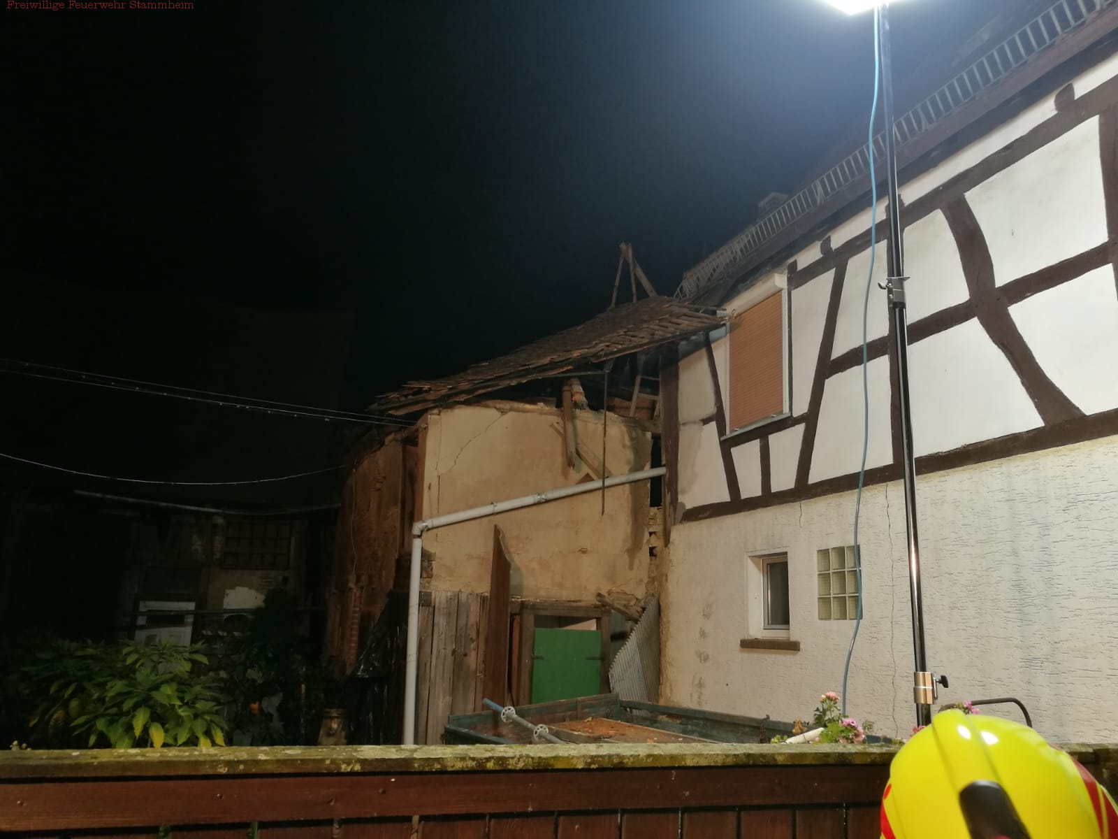 Vergangen Mittwoch wurde unsere Wehr kurz nach Mitternacht mit dem Stichwort „Hilfeleistung“ alarmiert. Der Einsatzort befand sich in der Hohlbergstraße in Stammheim. Dort angekommen wurde beim Erkunden der Einsatzstelle ein eingestürztes Dach eines landwirtschaftlichen Gebäudes vorgefunden, das zum Teil auch das Nachbarhaus beschädigt hatte. Somit wurde die Einsatzstelle zuerst mit Power-Moon und Strahlern ausgeleuchtet. Nach Beratung mit dem Stadtbrandinspektor und dem Kreisbrandmeister Matthias Nickel wurde ein Fachmann des THW hinzugezogen, um die Lage besser einzuschätzen. Der Gefahrenbereich wurde abgesperrt und kleine Teile wurden vom Dach entfernt.