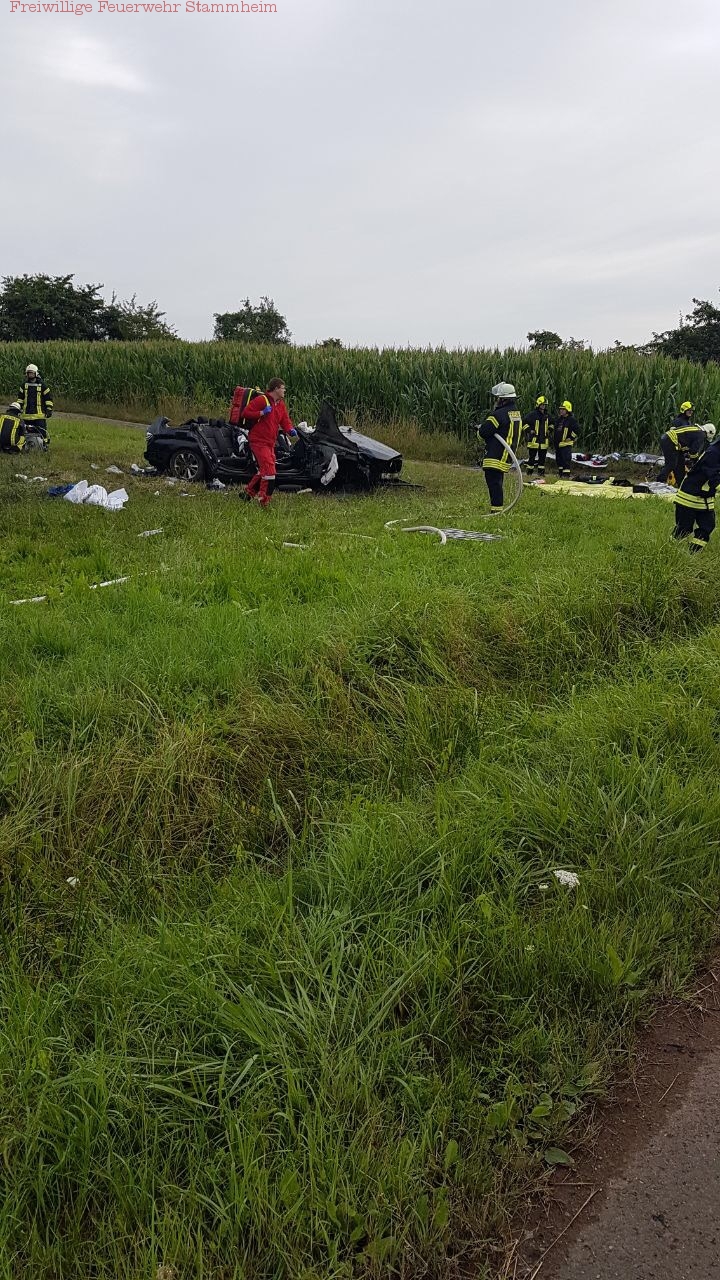Am Sonntag, 16.07.2017, wurde die Freiwillige Feuerwehr Stammheim gegen 7:00 Uhr unter dem Stichwort "Verkehrsunfall - eingeklemmte Person" auf die L 3188 zwischen Ortausgang in Richtung Stammheimer Kreuz und Sportplatz alarmiert. Vor Ort fanden wir ein stark beschädigtes Fahrzeug mit mehreren eingeklemmten Personen vor, das gegen einen Baum geprallt war und sich mehrfach überschlagen hatte.