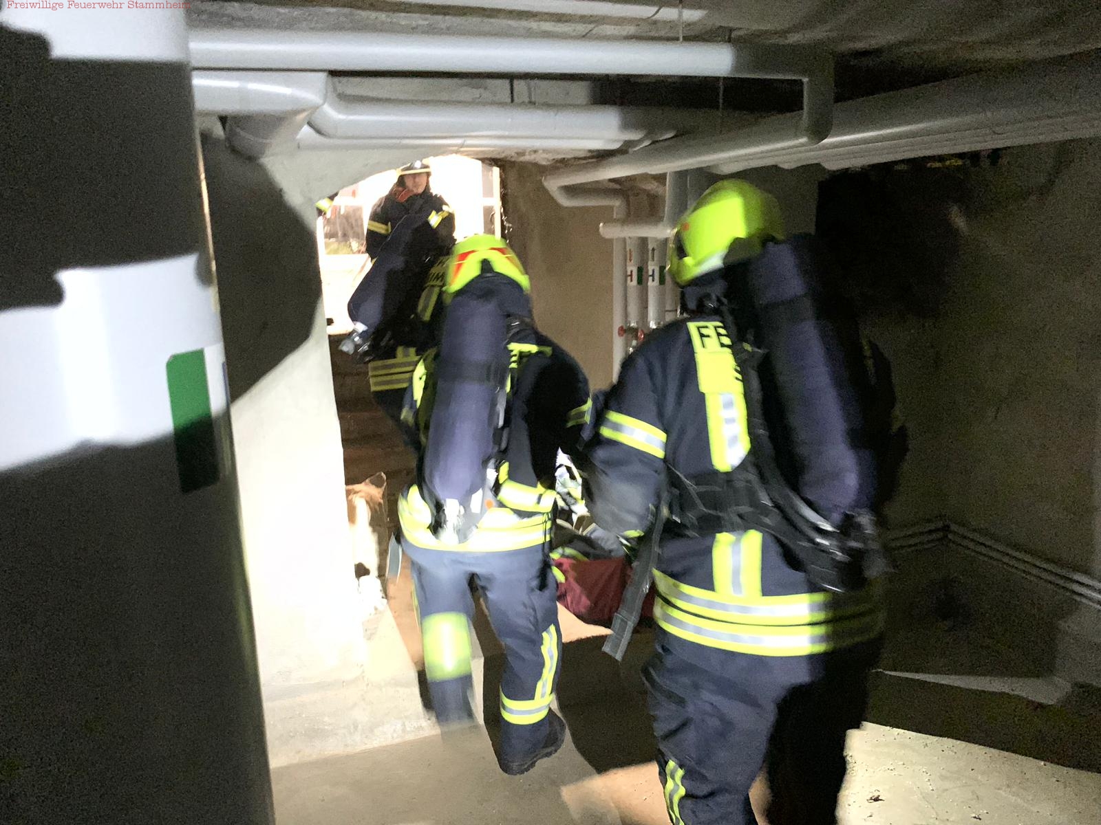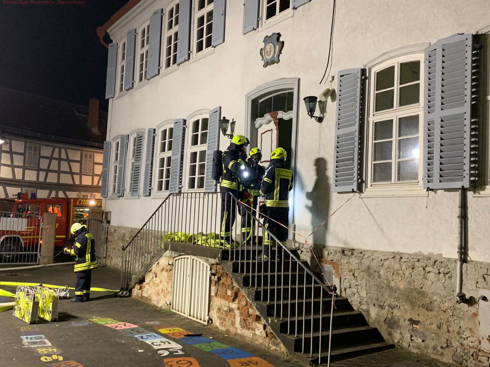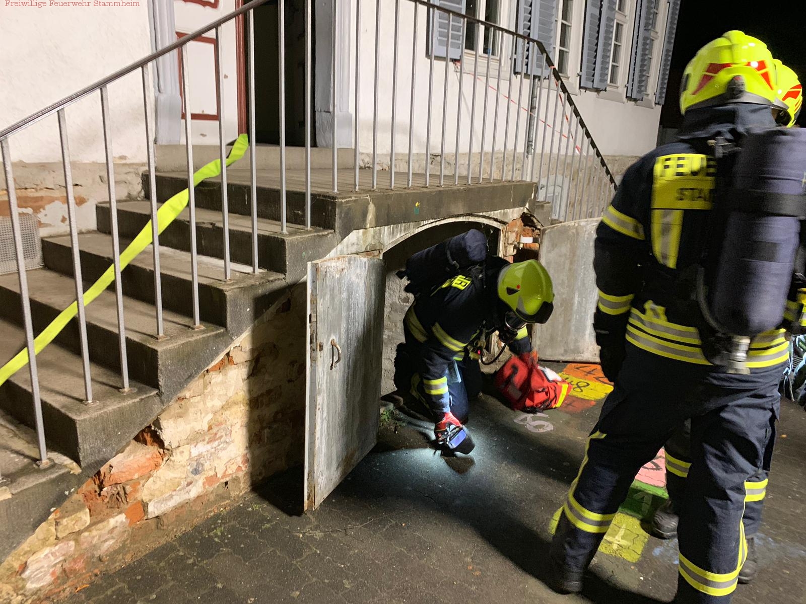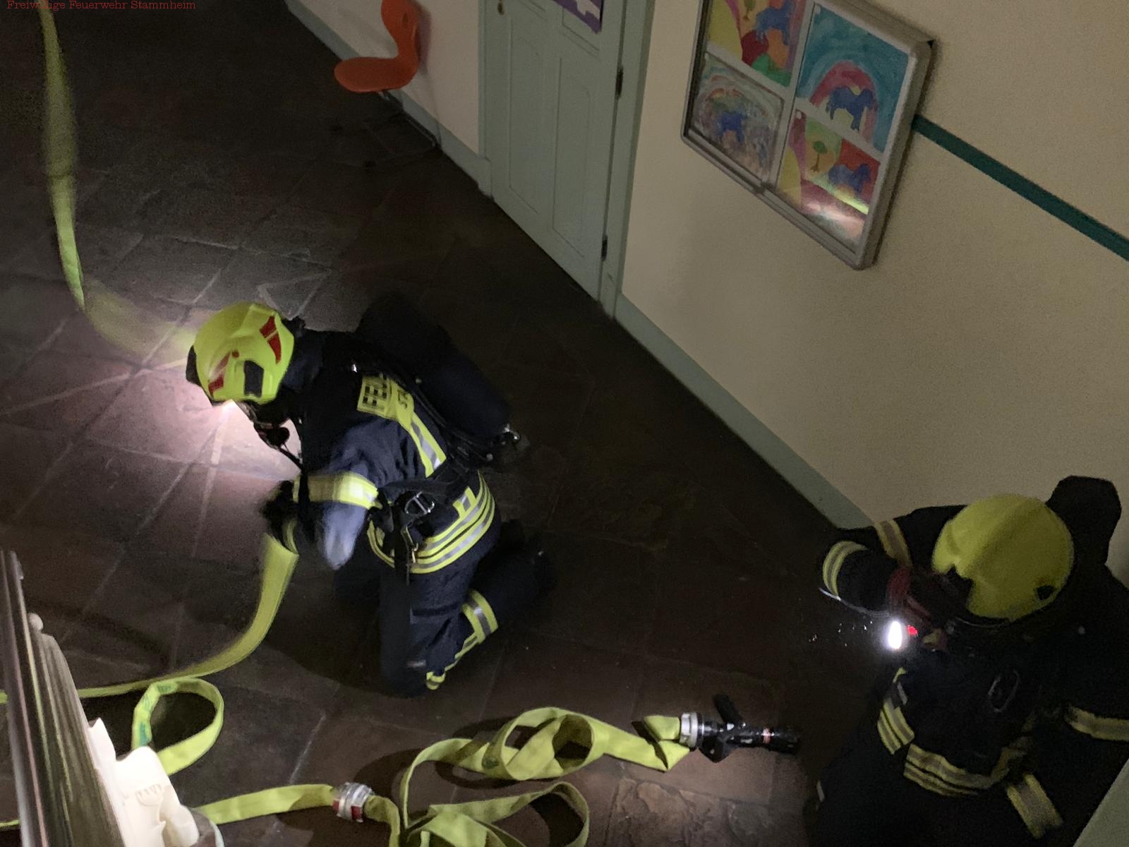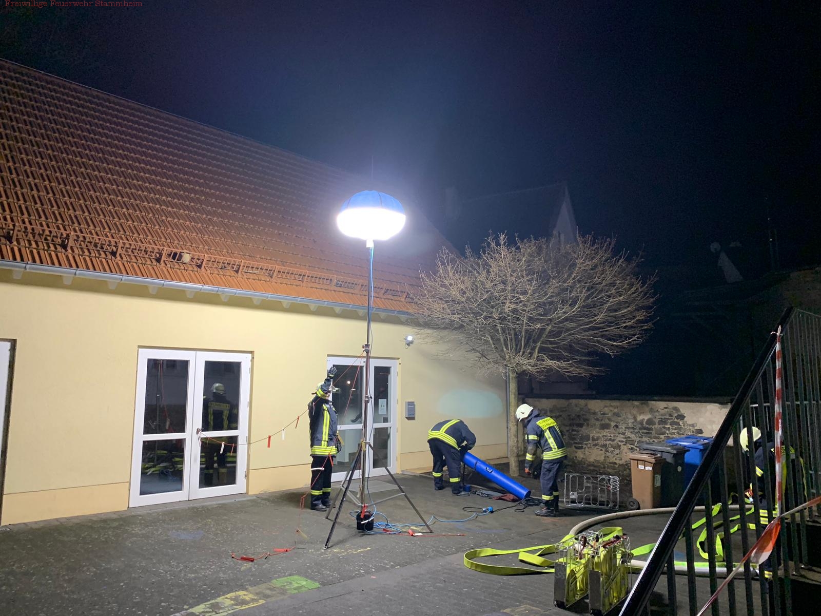 Geübt wurde in und an der Grundschule in Stammheim. Es galt zum einen den vermissten „Hausmeister“ im Keller des Gebäudes zu finden, als auch den „Brandherd“ ausfindig zu machen. Die übrigen Kameraden leuchteten den Einsatzort mit unserem Powermoon aus.