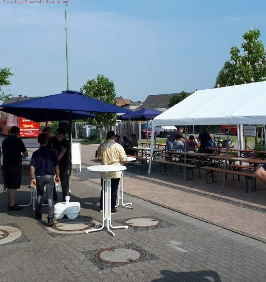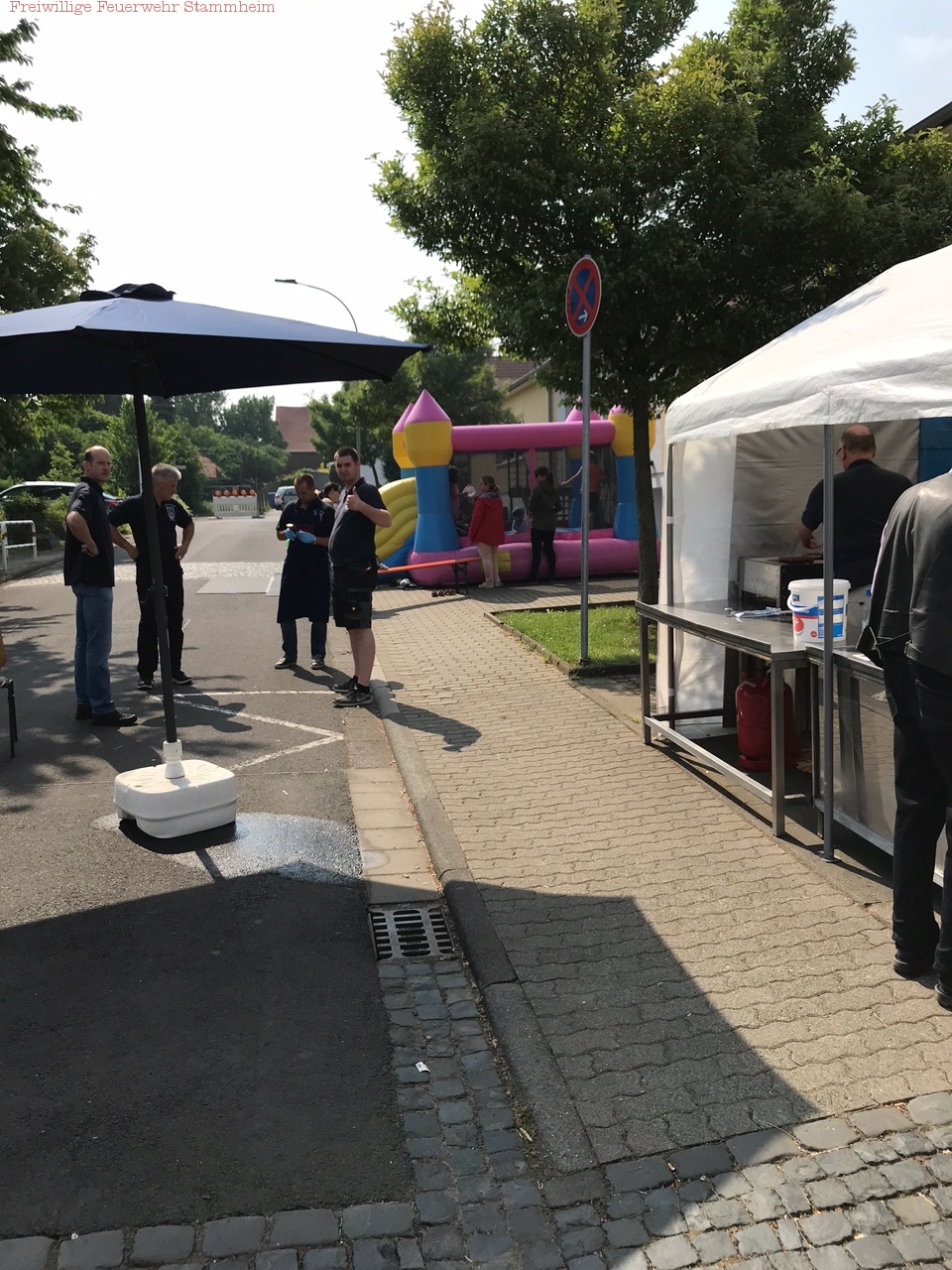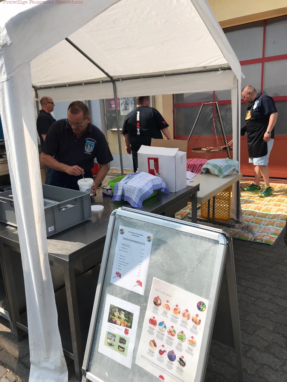 Der Verkauf der berühmten Bauchlappe, Steaks, Currywurst und Pommes lief ab 11:00 Uhr hervorragend an und riss bis nachmittags nicht ab. Auch an der Theke mit frisch gezapftem Bier und selbstgemachtem Apfelwein bildeten sich zuweilen Schlangen. Die Kinder konnten sich auf dem Spielplatz und erwähnter Hüpfburg austoben. Am Nachmittag wurde ein reichhaltiges Kuchen- und Tortenbuffet mit selbstgebackenen Spezialitäten angeboten, welches ebenfalls sehr gut angenommen wurde. Das Wetter spielte gar den ganzen Tag mit, von Regen war keine Spur zu erkennen. Die Jugendfeuerwehr Stammheim, welcher der gesamte Erlös zu Gute kommt, half bei der Bedienung der Gäste, der Betreuung der Hüpfburg und dem Abwasch.